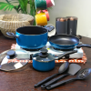 1 Dutch oven with lid, 1 slotted spoon, 1 serving spoon, 1 frying pan, 1 saucepan with lid and 1 turner